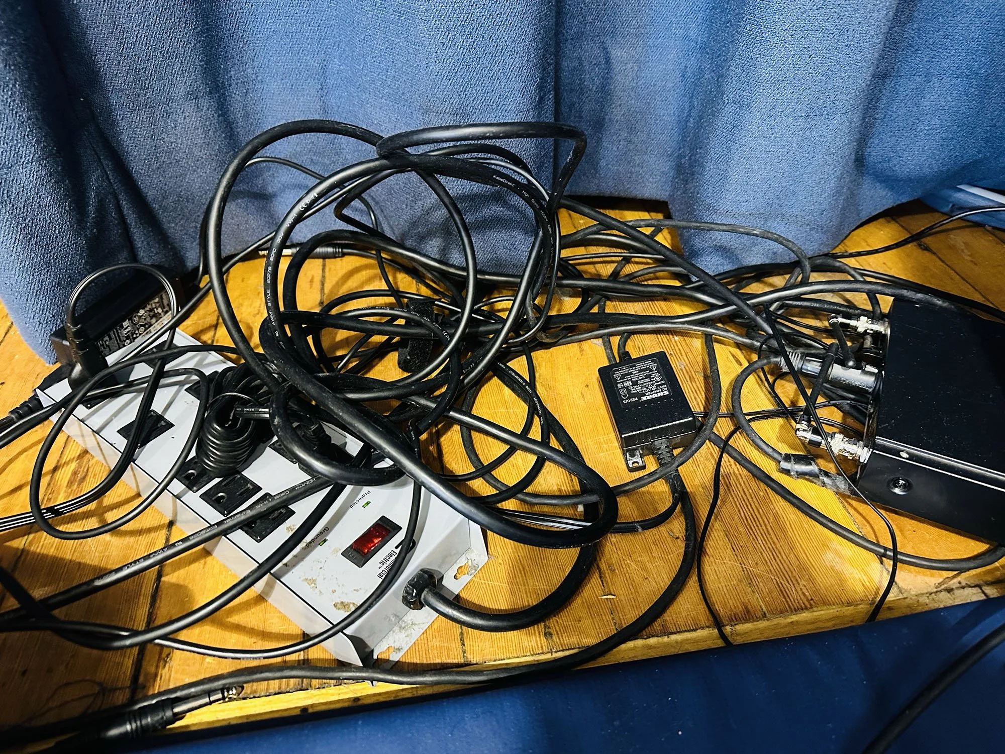 This is a tangled bunch of wires I was greeted by at a school. Because we discussed it in advance, there was a tech person ready to help me. Whew!